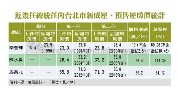 但若以上漲單價計算,則排行先後為馬英九總統,八年漲了三十點二萬/坪;其次為陳水扁總統,任內北市房價漲了二九點四萬/坪;最後才是李登輝,任內北市房價上漲價格最少,只漲了十萬/坪。李登輝剛繼任的一九九八年,當年北市新成屋、預售屋平均房價僅十六點四萬/坪,隔年卻大幅度飆漲到二十四萬/坪,一年房價漲幅竟高達約五成,如此驚人漲勢引爆無殼蝸牛運動、「萬人夜宿忠孝東路」。
