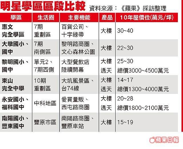許多學校逐年在減班,不過明星學區卻是年年額滿,台中市在西屯、南屯、北屯和豐原,都有9年明星學區,不只本地居民,隔壁行政區和外縣市的家長也在搶入籍,其中7期重劃區一帶,就有惠文、大墩、黎明等3處明星學區,密度最高。