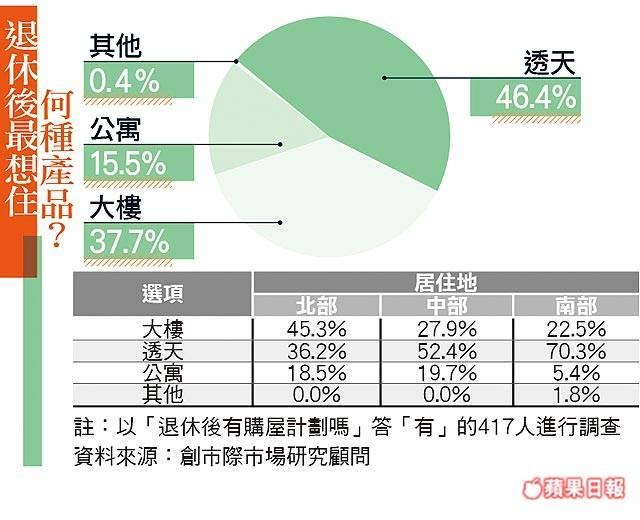 產品方面,退休宅以有天有地的「透天產品」最受喜愛,佔整體46.4%,從區域來看,中、南部超過5成民眾都想住透天產品,特別的是,北部民眾較青睞大樓產品,佔比45.3%。網路地產王總經理陳韻如分析,中南部民眾習慣有前庭後院的透天產品,故佔比高。