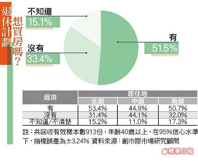 伴隨高齡化社會逐步發展,完善的退休生活愈來愈受重視。《蘋果》委託創市際市場研究顧問調查,從回收913份針對年齡40歲以上民眾進行退休購屋計劃調查中,顯示有51.5%民眾退休後有購屋計劃。國立屏東大學不動產經營系教授賴碧瑩認為,台灣現屬超高齡社會,超過65歲的人口佔總人口12%以上,因此對退休規劃日趨慎重,她認為若受訪者原為租房子,退休想買房的概念一般想安居樂業,但若原本就有房子的民眾想買退休宅,大多手頭資金足夠,退休後希望有獨立空間能安養天年。