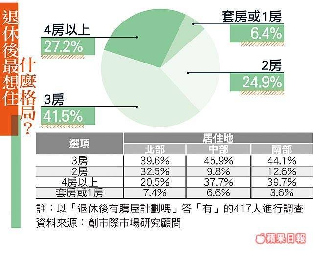 針對退休族心儀的房屋格局,3房產品佔整體41.5%居冠,蔡芳文解釋,一般退休族多想與家人同住,3房格局較為足夠,有趣的是,北部民眾第2名為2房格局,中、南部第2名則為4房以上格局。淡江大學產經系副教授莊孟翰解釋,北部因社會觀念改變,父母與子女同住的情形日趨減少,然而南部民眾思維較傳統,子女婚後多與父母同住,多房型產品較受青睞,陳韻如補充,北部因房價較高,不少年長者會偏好小宅產品,多餘資金能留在身上彈性運用。