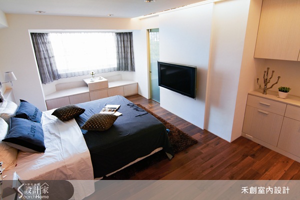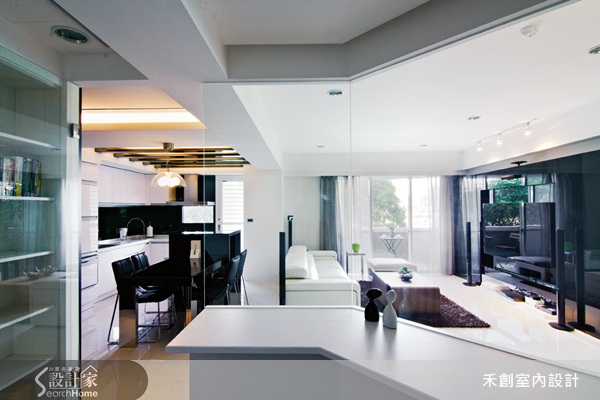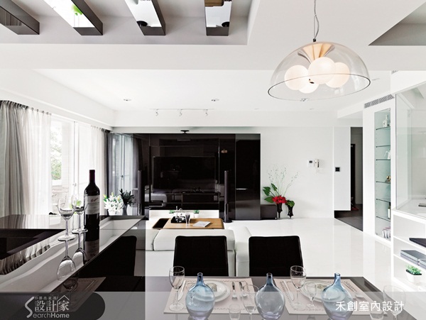 像是走進偶像劇中的浪漫場景,明亮日光在開放式的空間中緩緩灑落,向內漫延深入,觸及室內每個角落,色調上採用男屋主最愛的黑、白對比,客廳處一整面黑色玻璃烤漆黑常有質感,透過材質的映射效果,反映窗外的綠意景致,在時尚簡潔中保有感性的生活溫度。餐廚區機能齊備,包含用餐餐桌和兩人吧台,天花處的鏤空金屬格柵醞釀燈光的豐富變化,在一片黑白時髦之中,增添羅曼蒂克的生活情調。書房則運用玻璃隔間,讓視野無私穿透,也更加貼近與另一半相處的距離。主臥室鋪上暖木色地坪,為俐落的對比色調增添溫馨感,豐富的收納和機能,更顯舒適感;另外,為長輩貼心規劃的孝親房,除了基本機能安排,也利用半身高的雙面櫃體,區隔出一個閱讀小天地。